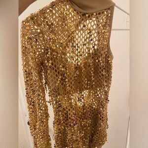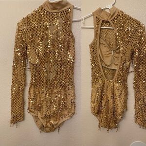 Kelle solo dance jazz acro costume gold fishnet fringe leotare SA-Small adult