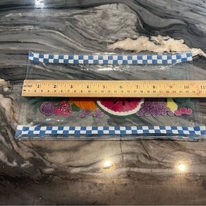This fused glass serving platter is in excellent condition. The fruit pattern is beautifully done with a checkerboard border. Measurements are provided in the photographs. It is 11 inches long by 5 1/2 inches wide. This tray can be used for serving food, as a trinket dish or a display piece. I especially love the way the watermelon is done.
