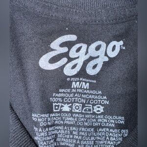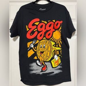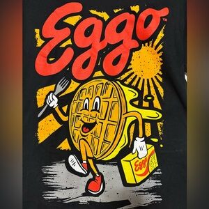 Black t-shirt featuring a vibrant Eggo waffle graphic with red, yellow, and white accents. NWOT excellent condition