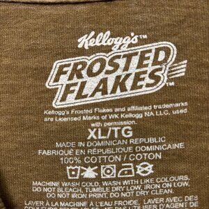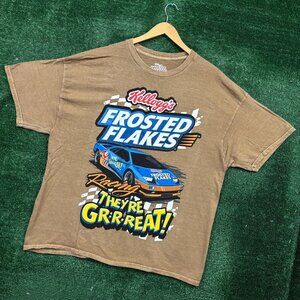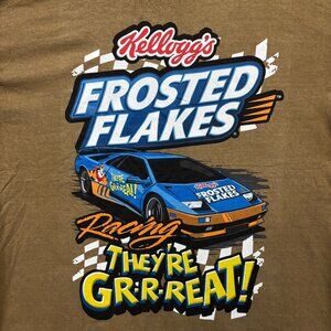 Kelloggs Frosted Flakes Racing Graphic tan T-shirt size extra large. Generally measures 26 inches pit to pit 30 inches long . Nice graphic design T-Shirt for streetwear. New never worn and in great condition T-Shirt