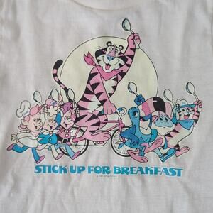 Vintage 1980s cereal box reward kids medium 10 12 two guys 50/50 polyester combed cotton Kellogg's cereal company stick up for breakfast crack Snapple pop Tony the tiger Tony Jr. toucan Sam t-shirt.