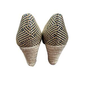 A stylish and versatile pair of peep-toe wedges featuring a herringbone pattern and bow accents. Perfectly suited for both casual and semi-formal settings. This is a beautiful pair in new unused condition and no defects notedd at all. I ship really fast. SKU 8582