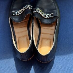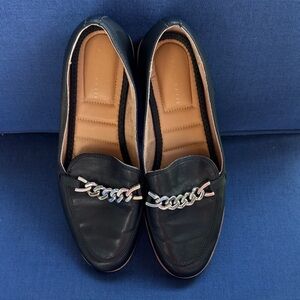 Elegant black flats featuring a striking silver chain. Perfect for everyday elegance.