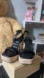 Stylish black wedges with tan espadrille soles. Perfect for versatile wear.