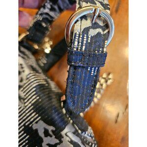 This stylish crossbody bag features a navy blue and white floral design, perfect for adding a touch of elegance to any outfit. Its compact size makes it ideal for everyday use or special occasions.