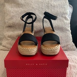 Kelly & Katie Faydrena Espadrille Wedge Sandals. In excellent used condition. Worn only twice. Cute style with ankle straps and gold buckle. Black suede with rope on sides. Size 9.5M.