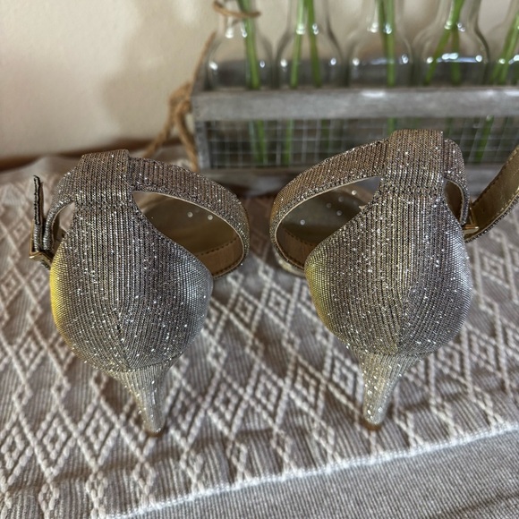 Kelly & Katie Gold and Silver Shiny "KK Chris" Ankle Strap Heels. Size 7. Cross over straps with ankle strap. 3” heel. Shimmery, sparkly formal heels for wedding, or eventful night out. Original box. Pre,owned, gently worn. Gold toned buckle.