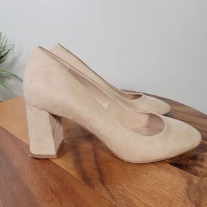 Step out in style with these elegant beige block heel pumps. Soft faux suede. Rounded toe. Classic pumps.