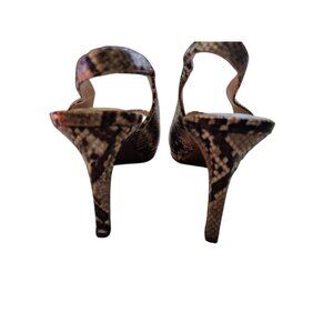 Snakeskin stiletto peep toe heels. Pull-on. No visible defects or scuff marks. About 3.25 inch heel height.