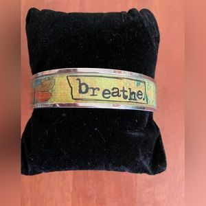 Kelly Rae Robert bangle. Soulful jewelry to inspire and uplift. Sentiment words “slow down” “breathe” and “be present”. Nature background! Silver tone. Made of zinc, alloy and epoxy. 2.75 inches in diameter. New without tags!