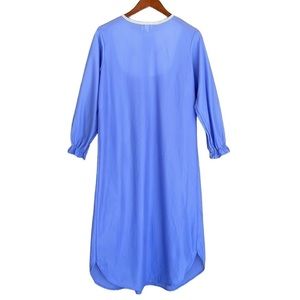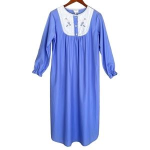Kelly Reed, Vintage, Floral Embroidered Detail, Long Sleeve, Long Night Gown. Purple with purple & pink embroidered flowers over white. Pullover with three button front closure with pleated detail. Elastic at cuff. Rounded hemline. 100%. Size medium. See photos for measurements to ensure fit.