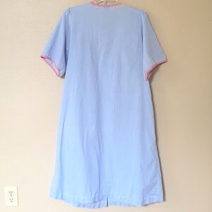 EUC Kelly Reed vintage blue and white striped night gown with apple applique detailing at the chest, pockets and button front