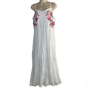 Kelly Renee white floral embroidered maxi dress. Vneck. Defined elastic waist. Adjustable spaghetti straps. Tiered ruffle hem. Lined. 77% rayon, 23% polyester. Lining is 100% polyester