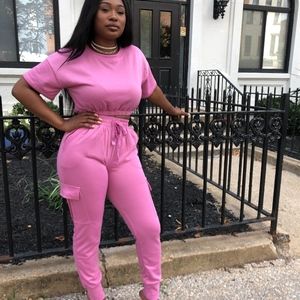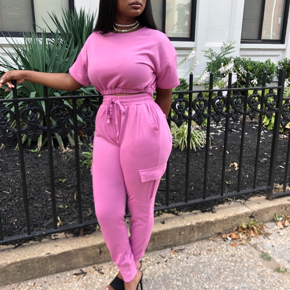 Short sleeve top is styled with a cropped fit that has an elasticized waist line, and a wide round neck. Joggers are detailed with cargo pockets at sides, patch pockets at back, a high rise waist line with draw string ties, and elasticized cuffs at bottom.