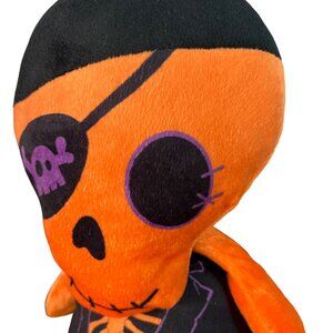 Halloween-themed soft plush toy with pirate skeleton design. Eye-catching orange and black colors. Ideal for seasonal decor or gifting.