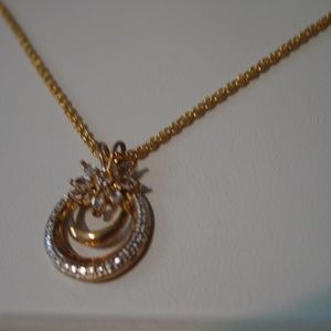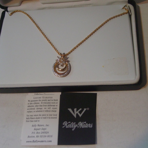 This is a new in the original box Kelly Waters gold over sterling crystal necklace in great shape.The chain is 18" long. Beautiful necklace.