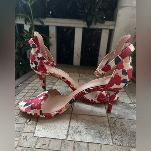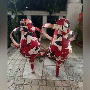 Step out in style with these chic floral heels. Perfect for any occasion, these shoes feature a vibrant red and cream design that adds a pop of color to your outfit.