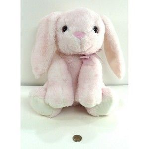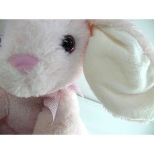 Super soft blush pink bunny. Long floppy ears, plaid bow. Sitting size approx: 12". Quality kellytoy.