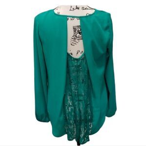 Long sleeve size small unsure of brand since tag had been removed but so cute. No damage at all the top is solid green, in the back it has a split that reveals beautiful green lace