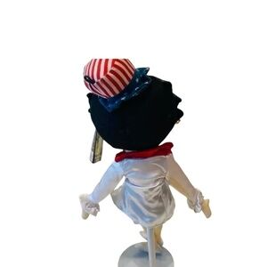 This vintage Betty Boop rag doll by Kellytoy features a patriotic theme. She is dressed in a star-spangled outfit and a red, white, and blue top hat. Each rag doll is unique. The stand is not included.