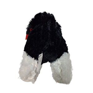 Kellytoy puppy dog in black and white, holding a red bone with kisses. Measures 12 inches.