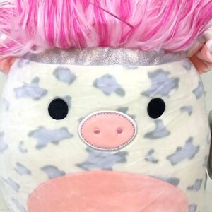 Brand new with tags! This line of Squishmallow is called a Squish-Doo, made tall with crazy hair! She is a white pig with light gray spots and light pink accents. She has hot pink hair with lighter accents and is 10 inches tall, almost 12 if you count her hair.