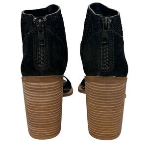 Style: Black suede leather block 4.2" heels. Open toe with a strap and ankle cuff that feature a textured geometric pattern. Back zipper closure. Upper is leather while the rest is man made. Does not come with original box.