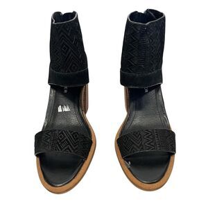 Kelsi Dagger Black Leather Suede Open Toe Strap Cuff Heels 5.5 Geometric Pattern