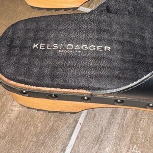 Kelsi Dagger Black and Brown Clogs with Buckle Strap