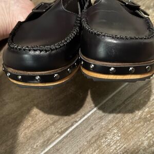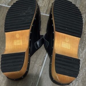 These Kelsi Dagger mules feature a sleek black leather upper complemented by a rich brown wooden sole. The standout buckle strap and metallic studs add a contemporary flair to the classic clog design. With an open-back style, these mules offer both comfort and effortless elegance.