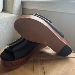 Elegant size 10 black Kelsi Dagger Brooklyn Dover platform sandals with a bold gold buckle accent. So trendy and versatile ☀️