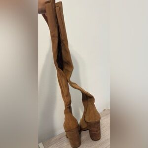Kelsi Dagger Brooklyn Logan Fawn Thigh High Suede Boots Stacked Heel Chic Size 7
