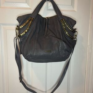 Kelsi Dagger Leather Gray Hobo Crossbody Shoulder bag With Brass Rivets.back pocket with snap closure.Top zipper the inside lining has a side zipper two side pockets.Pre owned in good used condition normal wear clean see all pictures any questions please message.M10