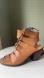 Kelsi Dagger sandal with a light brown, almost tan-colored leather upper and a dark brown, block heel. The sandal has a unique gladiator-style design with cutouts and laces. The laces are dark and appear to be tied up the front of the shoe. Kelsi Dagger is a brand known for its trendy and stylish footwear. heeled sandals /ankle booties feature unique details like cutouts, laces, and block heel