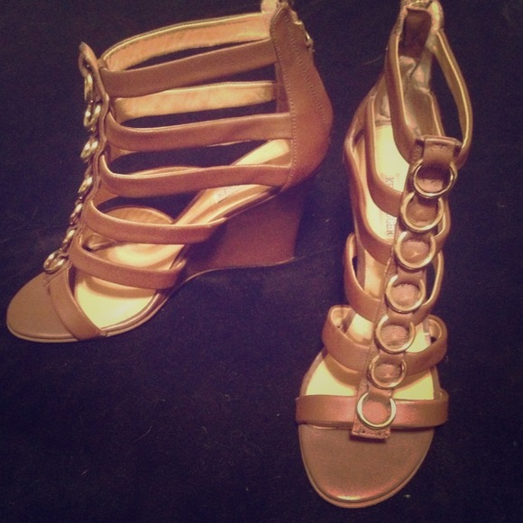 9.5 Wedges-4 inch heel. Light brown leather in excellent condition. Gold details. Wore once but they were too big on me.