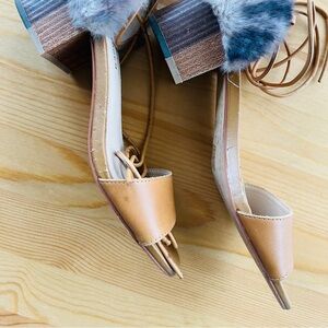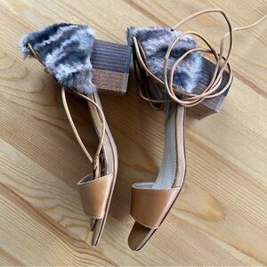 These Kelsi Dagger heels feature a stylish tan and gray faux fur with a chunky medium-height heel. Pre-loved - has scuffs on sides (see photos) and is reflected in the price. Size 5.5.