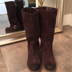 Kelsi Dagger-Maroon slouchy suede pill on boots with gold buckle accent on side and back of boot.