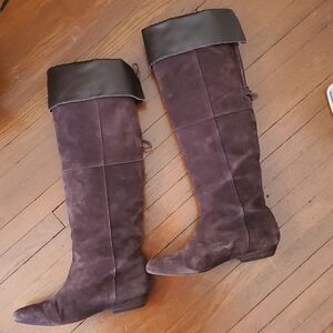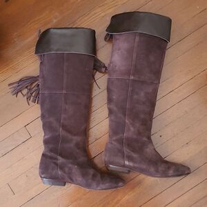 in a deep brown microsuede. Signs of wear on the soles and inside if worn cuffed. look great uncuffed! Suede is in great shape♡