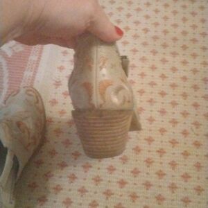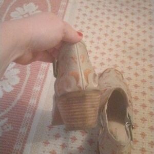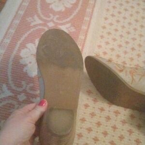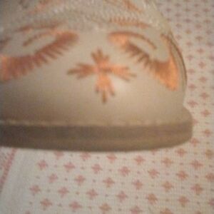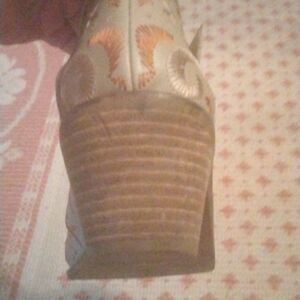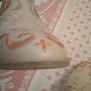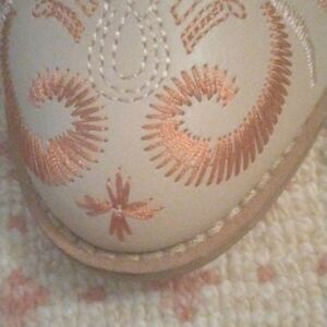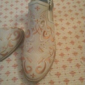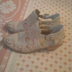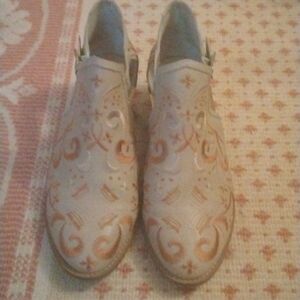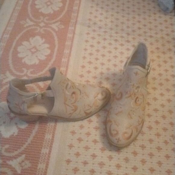 Great quality leather ankle boots with open sides and embroidery. These boots are so cute. Some wear on the back of the bottom of the heels.