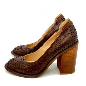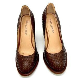 Features dark brown leather with laser-cut detail. 4 inch stacked leather heel.