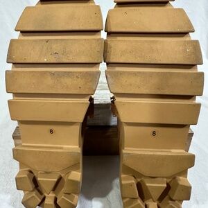 Excellent condition. Kelsie Dagger Funky Leather Platform Slide Loafer. Very soft tan leather with fleece lines insole. lightweight metal chunky gold band across the top makes this shoe very unique. 2" Heel 1" Platform. This shoe runs large, I usually take an 8.5.