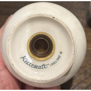 The Keltcraft Noritake green and gold trim Glen salt and pepper shakers are a set of two original and decorative pieces made in Ireland. These shakers feature a colorful multicolor design that adds a touch of elegance to the dining table. With the Noritake brand known for quality craftsmanship, these shakers are both functional and stylish, making them a charming addition to any collection of dinnerware or pottery.