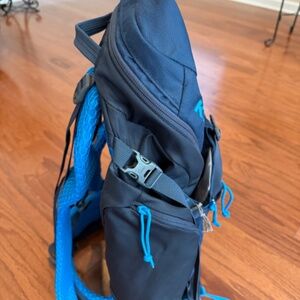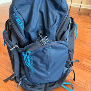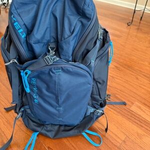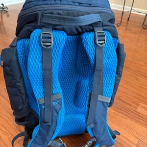 Kelty Redwing 44 backpack, this pack is great for backpacking or travel. There are a lot of pockets and stash areas. This backpack also has a fantastic waist strap that allows for distribution of the weight of the pack. This is a brand new backpack never used. If more information is desired about this backpack it can be found on YT under the name and model. The color is navy and bluish green/lighter blue. This backpack is unisex and can be used both by women and men.
