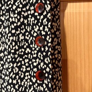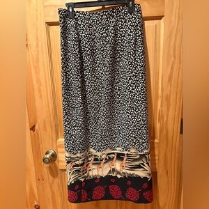 Kemp Collection long skirt, likely from the 1990s, featuring a black and white cheetah print at the top, a tan and brown giraffe scene in the middle, and a black border with red leaf-like shapes at the bottom. Side buttons good condition. See measurements to insure this skirt will be the correct fit for you. Thanks for looking!