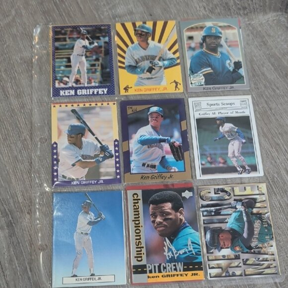 Collection of Ken Griffey Jr. baseball cards. Features various designs and images of the player.