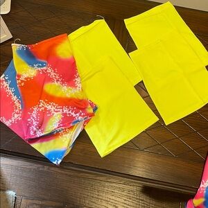 Vibrant sleeveless vest with a matching shorts, shirt, visor, arm and leg bands, Features a colorful pattern with pink, blue, and yellow hues. Great Halloween costume!