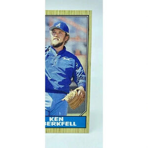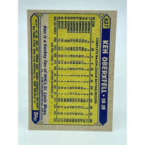 This is a vintage 1987 Topps baseball trading card featuring Ken Oberkfell, a former player for the Atlanta Braves. The card is part of the MLB Fresh Pack Mint series and has a card number of #627. It is a standard size trading card manufactured by Topps in 1987. The card is in English language and is perfect for collectors of vintage baseball trading cards. The card showcases an image of Ken Oberkfell in his Atlanta Braves uniform.