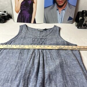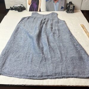 Beautiful Kenar 100% Linen Shift Dress in a timeless chambray-blue tone.