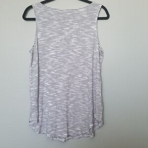 Light staining at armpit. Soft stretch fabric. Light wash wear on fabric, see close up. Theres also a very faint yellow spot on the front, its very hard to see. Great alone or layered with a jean jacket. Neutral, spring, summer, lounge, normcore, basic