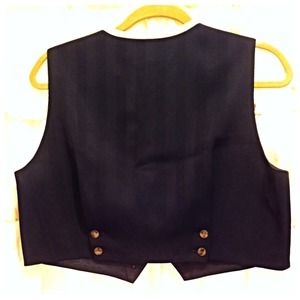 Black vest with tan piping detail around collar. 9 tortoise-color buttons and faux pockets on front. Fully lined - Herringbone stitch pattern on top layer, solid black lining. Pleated button details on back. Adorable with leggings or skinny jeans, long blouse and boots! Like new condition. Exquisite tailored detailing. 55% Triacetate, 35% Rayon, 10% Polyester. Lining 100% Rayon. Dry Clean Only.